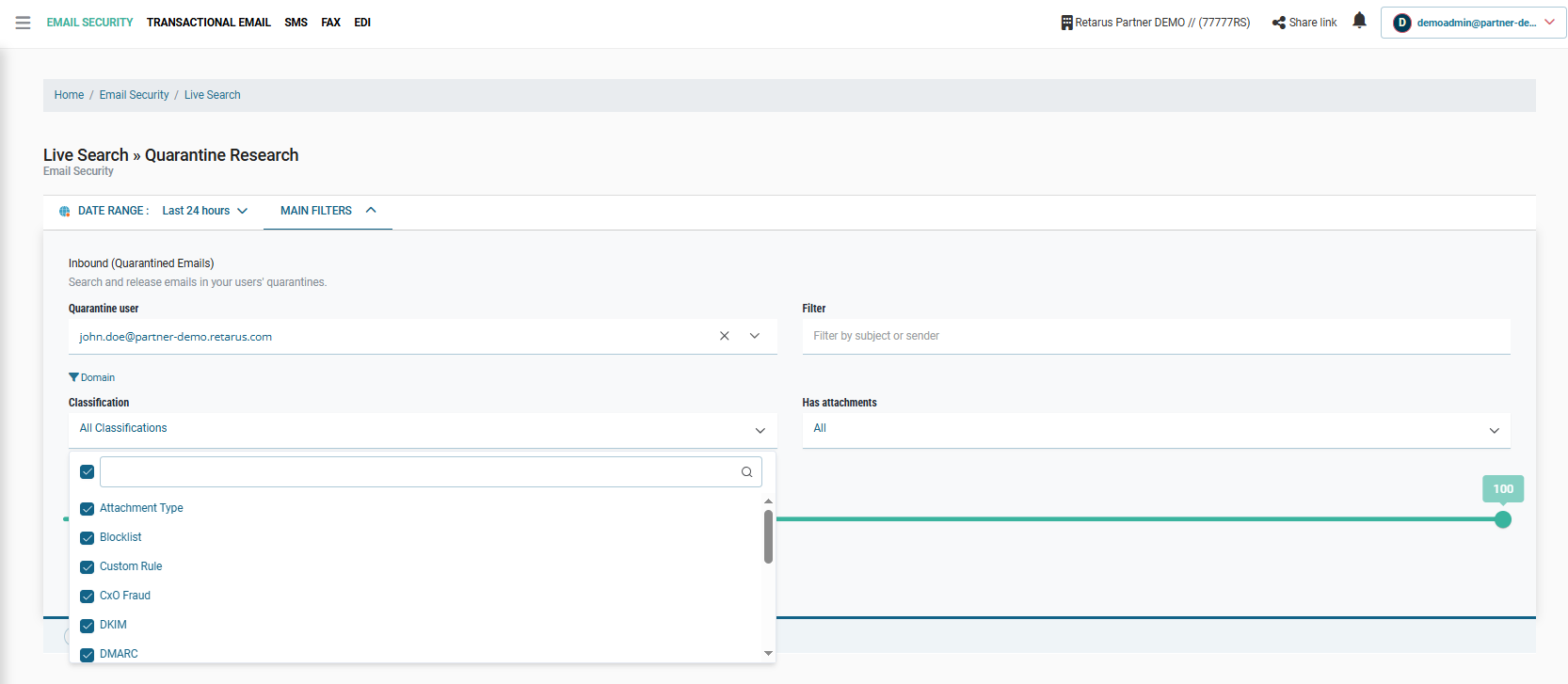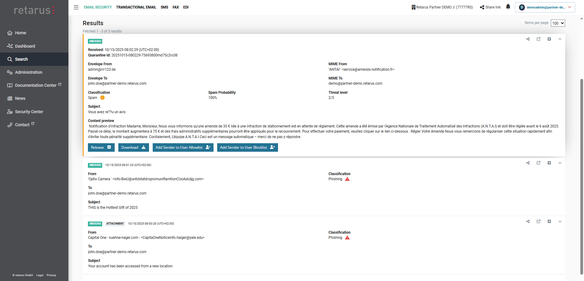 Neben der schnellen Abarbeitung von Benutzeranfragen bietet Quarantine Release in der täglichen Praxis weitere konkrete Mehrwerte bei der Fehleranalyse. Dank der detaillierten Suchkriterien (etwa nach Klassifizierzungen, siehe oben) lassen sich unternehmensinterne Regeln und Einstellungen und damit die Filterqualität optimieren. Darüber hinaus sorgen die umfassenden und transparenten Daten für zusätzliche Sicherheit: Ähnlich wie auch in der Retarus Email Live Search Funktion sehen Admins in Echtzeit, weshalb genau eine Nachricht in der Quarantäne gelandet ist und welcher Prüfmechanismus gegriffen hat. Angaben zu Threat Level und Spam-Wahrscheinlichkeit erleichtern zudem die fundierte Einschätzung des individuellen Risikos.