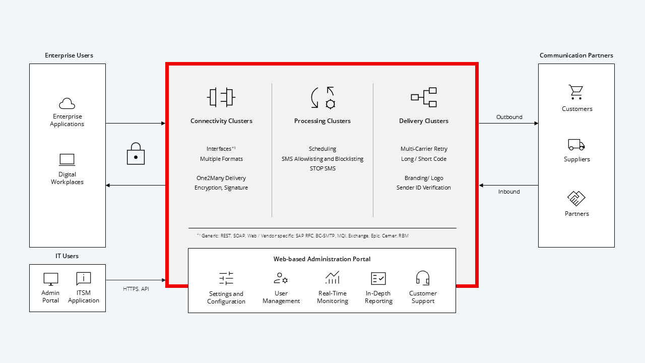 Enterprise-Cloud-SMS-Lösungen lassen sich nahtlos in bestehende IT-Landschaften, Applikationen und Geschäftsprozesse integrieren. Dafür sorgen unter anderem standardisierte Protokolle, APIs und Konnektoren. Dies steigert die operative Effizienz und schafft die Basis für anspruchsvolle, automatisierte Kommunikationsszenarien.